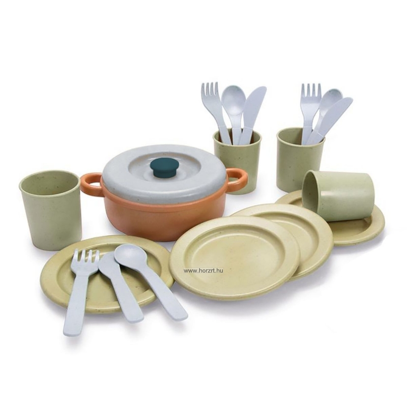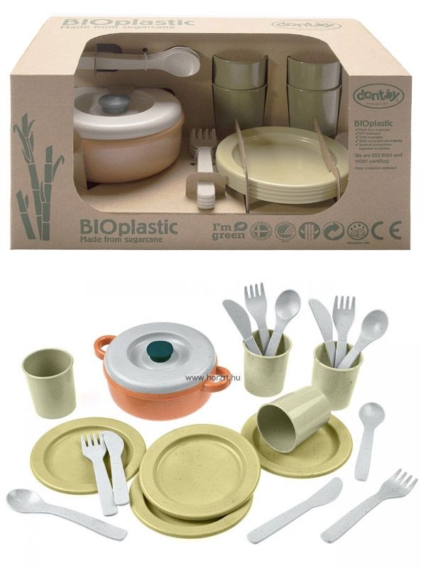 A termékek mosogatógépben moshatók. Nem tartalmaznak mérgező anyagokat, környezetbarát bioműanyagból készült, cukornád alapanyagú, így a gyermekek nyugodtan ehetnek-ihatnak a termékből. Barna, környezetkímélő ajándék csomagolás! A készlet tartalma: 4db. tányér, 4db. csésze, 4db. kés, 4db. villa, 1db. serpenyő és 1db. fedő. 24 hónapos korú gyermekek használatára CE minősítéssel ellátva! ÖNNEK AJÁNLJUK