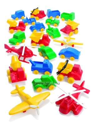 22 db 8-16 cm-es jármű (betonkeverő, helikopter,repülő, kisautó, teherautó, vontatóautó, konténerszállító) 4 színben.