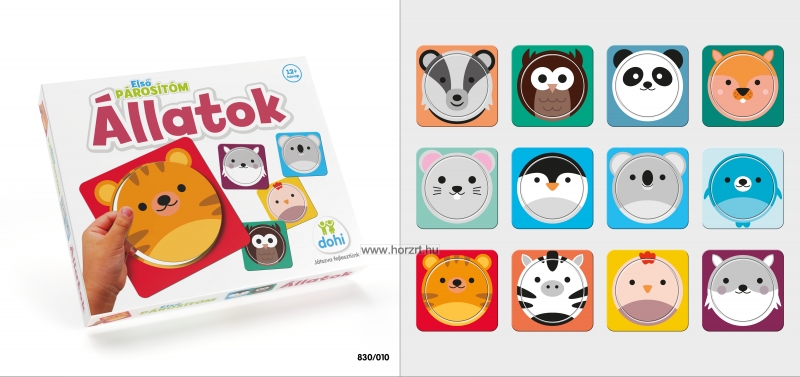 A dobozban 12 db kis kártyát találsz, amin állatok feje látható, pl. bagoly, pingvin, fóka, egér, zebra, tigris stb. Jól jegyezd meg, hogy melyik kártyában, melyik állat arca látható.