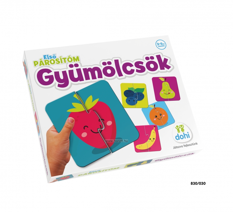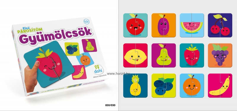 A dobozban 24 db fél kártyát találsz, amin különböző gyümölcsök szerepelnek. Jól jegyezd meg, hogy melyik kártyának melyik a másik fele.