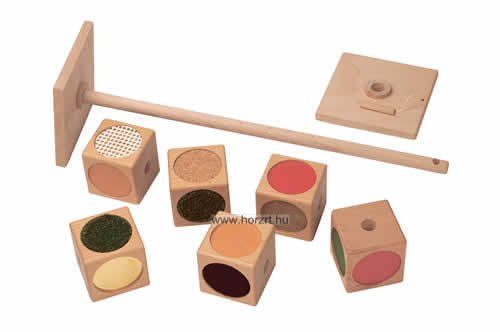 A gyerekek anyag felismerését segíti a változatosan összeállított készlet. Nehezíti a feladatot, hogy a mintákat bekötött szemmel kell összepárosítani, szétválogatni.