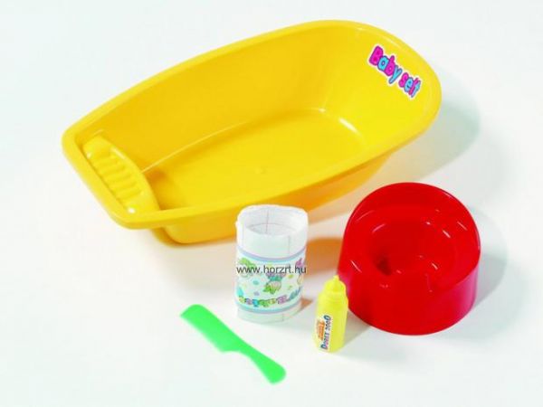 A szett tartalma: 1 db babakád, 1 db babafésű, 1 db cumisüveg, 1 db játékbili, 1 db textil törülköző