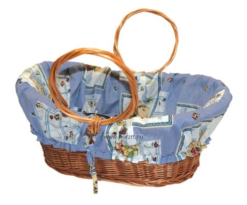 A fonott vesszőből készült mózeskosár két kör alakú fogantyúval lett kialakítva. Puha, kék színű, mintás textillel van bélelve. Szerepjátékok kitűnő kiegészítője. A kosárka mérete: 44x15/22x30 cm.