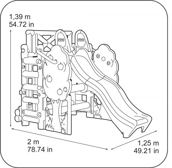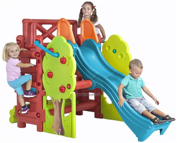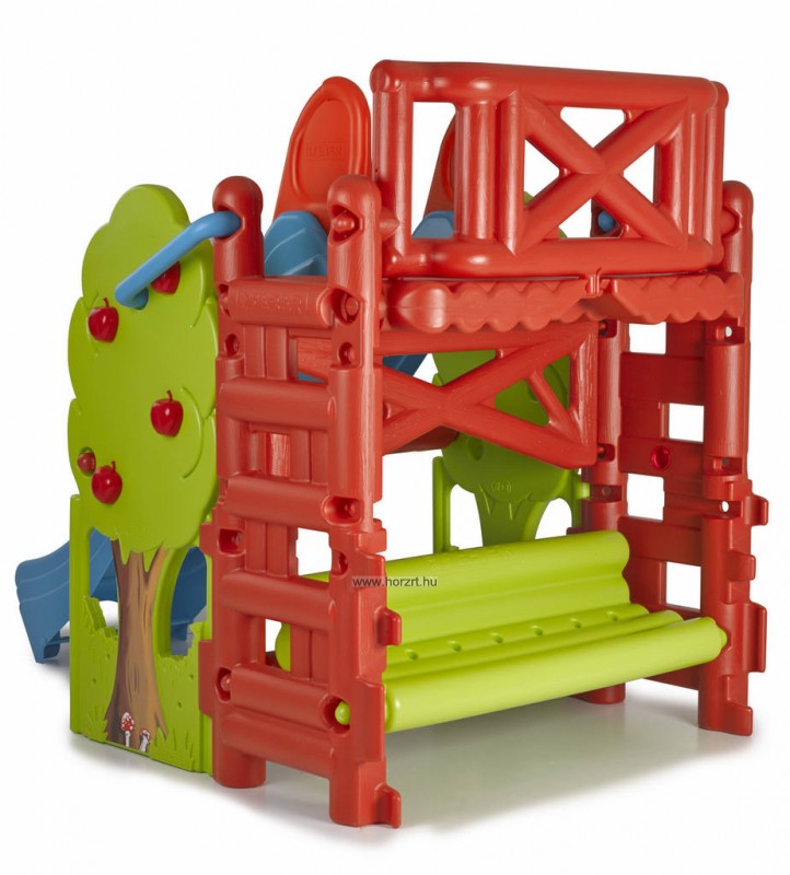 Almafát szimbolizáló játszósarok 4-5 gyermek számára. A gyerekek a két oldalon található létrán felmászva érhetnek fel a csúcsra, hogy aztán a 150 cm hosszú hullámos csúszdán a mélybe csússzanak. Különlegessége az almafák alatt található pad és egy kétfunkciós asztalka is, mely további játéklehetőséget rejt magában. Rajzolhatunk, vagy akár homokozhatunk is az almafák árnyékában.
