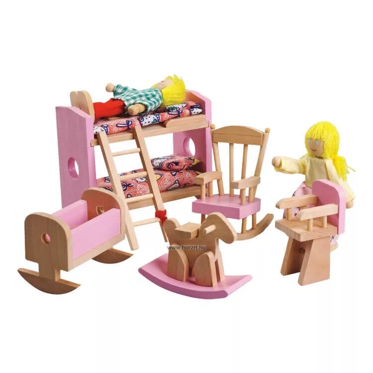 A szett tartalma többek között bölcső, hintaszék, gyerekszék, hintaló, emeletes ágy létrával.