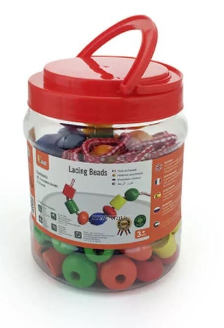 A gyöngyök mind különböző méretűek és formájúak, illetve színeikben is eltérnek egymástól. Mindez lehetővé teszi, hogy a gyerekek változatos és egyedi láncokat készíthessenek. Erős fa anyagának köszönhetően strapabíróak, hosszútávon is egy kedves és szeretett kiegészítője lehet a csoport- illetve gyermekszobáknak. A készlethez tartozó fűzőfonalak erős textil anyagból készültek, műanyag borítású, szűkített végekkel. A készlet elemei egy praktikus, fogantyúval ellátott műanyag tárolódobozban érkeznek. ÖNNEK AJÁNLJUK