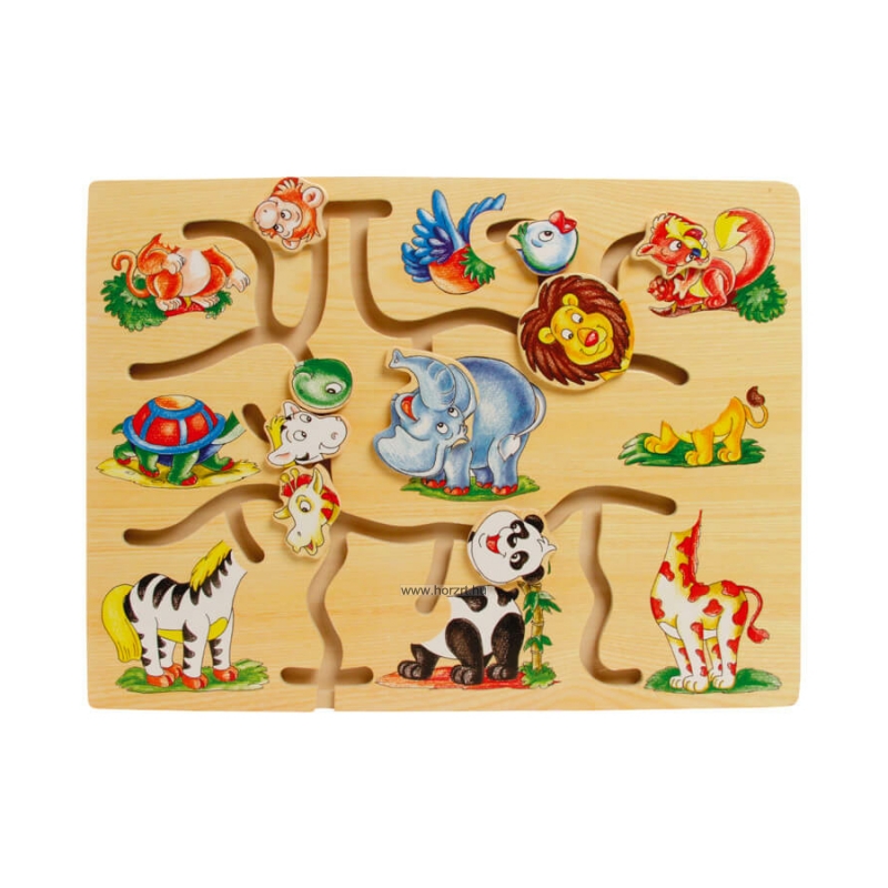 A fából készült állatos útvesztőben elkóboroltak a különböző állatok fejecskéi. Segíteni kell nekik, hogy újra a megfelelő helyre visszataláljanak.