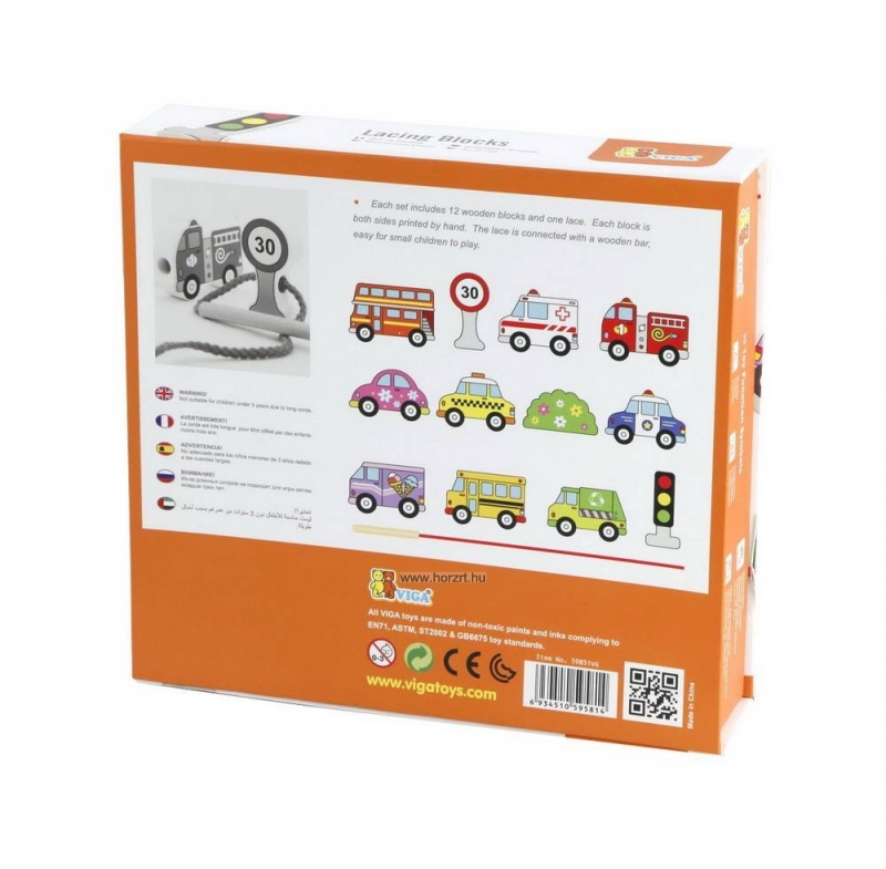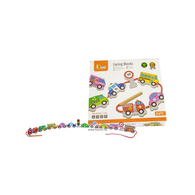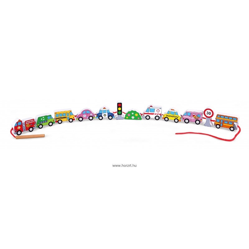 12 darab felfűzhető jármű, egy zsinór, a végén fa fűzőrúddal, hogy könnyen lehessen az autókat felfűzni a zsinórra.