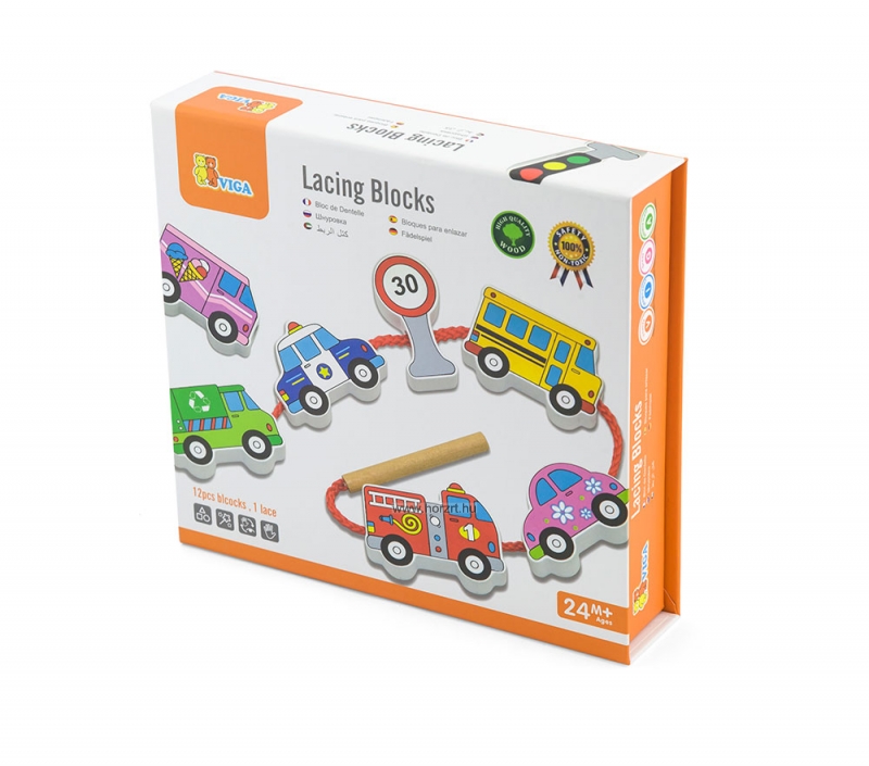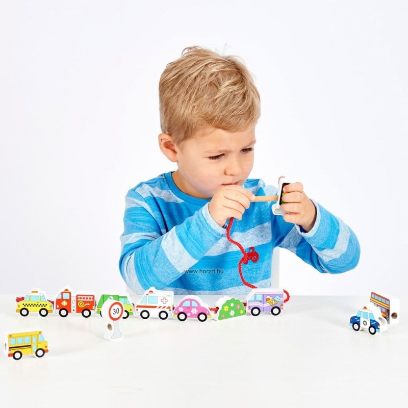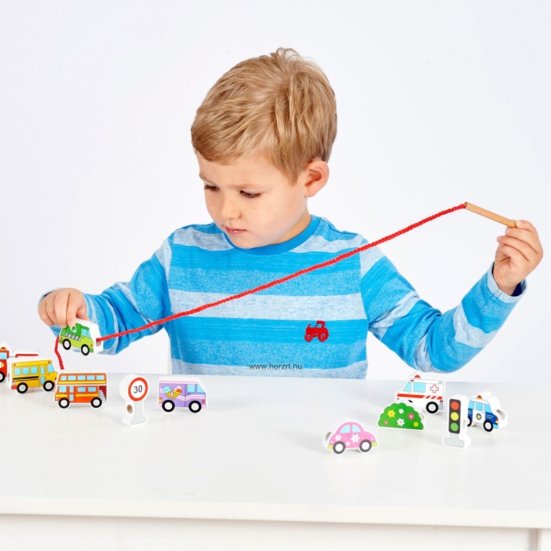 Fából készült fűző kisgyermekek részére, mely nagy elemeinek köszönhetőek könnyedén felfűzhetőek.