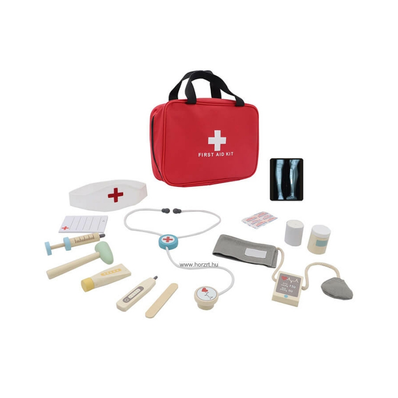 A fa és textil elemekből álló orvosi készlet összesen 13 darabból áll.