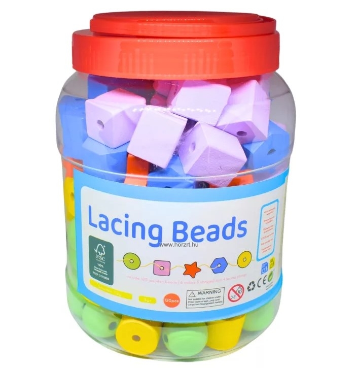 120 darabos fűző szett élénk színű, különböző formájú fagyöngyöket és vastag fűzőzsinórokat tartalmaz, hogy a gyerekek saját ékszereket, kígyókat vagy egyszerű színsorozatokat készíthessenek. A simára csiszolt, gyermekbarát festékkel kezelt faelemek biztonságosan megfoghatók, a zsinórok keményített végűek, így a befűzés könnyen megy már óvodás kézzel is.