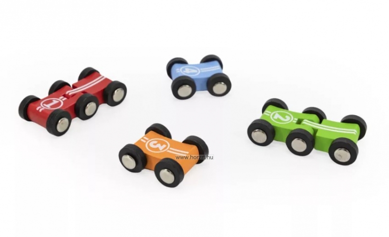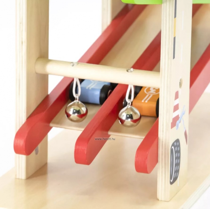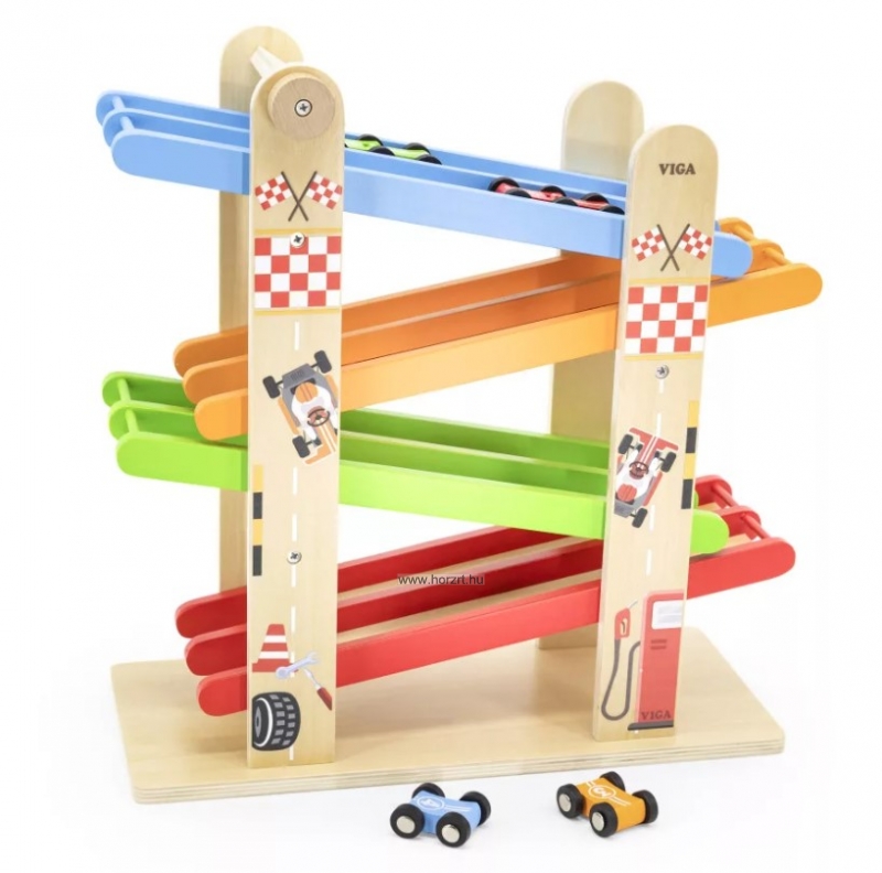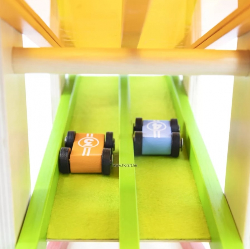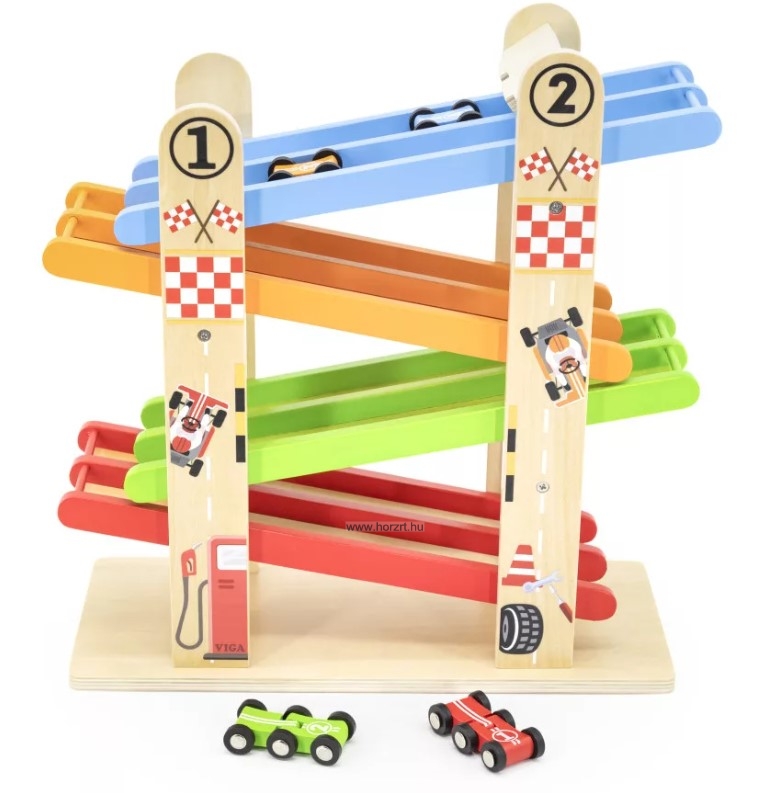Fa játék autópálya kétpályás csúszdával és négy színes (piros, narancssárga, kék, zöld) autóval, strapabíró kivitelben. A gravitáció erejét kihasználva tanítja meg a gyerkőcöket a mozgás és sebesség alapjaira, miközben élvezetes, önálló játékidőt is biztosít. Természetes fából készült, környezetbarát festékkel kezelve.