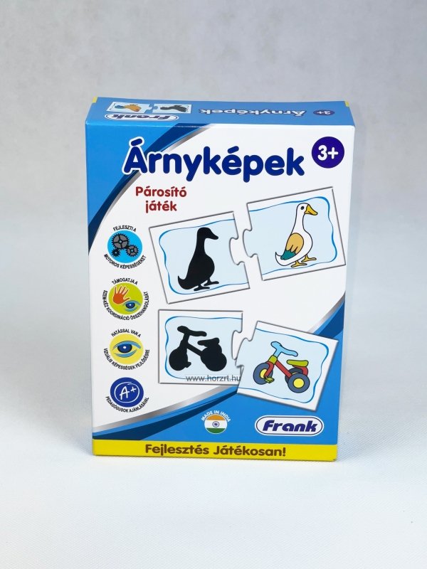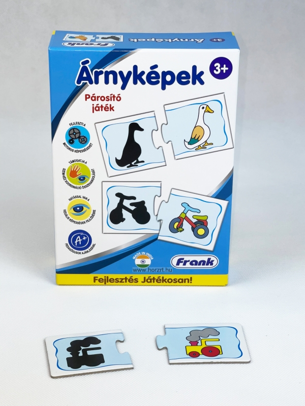 Különféle élőlények és tárgyak rajzának összepárosítása árnyképükkel. Ha a gyermek helyesen rakja össze a párokat, akkor a két kép pontosan illeszkedik egymáshoz, így a gyermek önmagát tudja ellenőrizni.