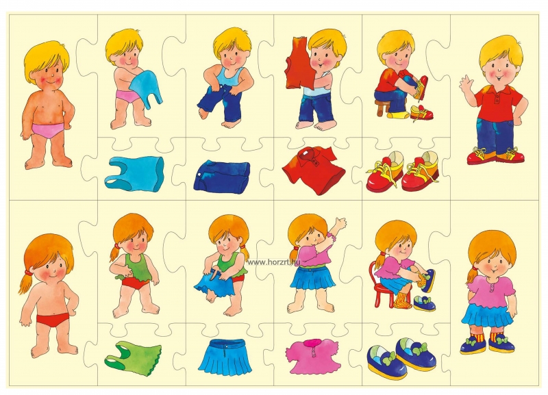Egy vidám öltöztetős játék, melynek segítségével fejleszthetjük a testsémát. A képeken egy kislány és egy kisfiú ruhadarabjait kell sorrendbe tenni és egymáshoz illeszteni.