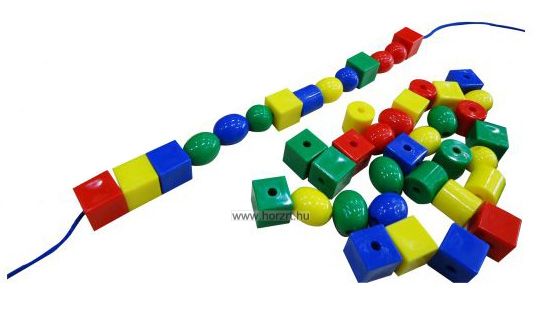A csomagban található zsinórra tetszőlegesen fel lehet fűzni a formákat, vagy gyakorolhatjuk a sorrendiséget.