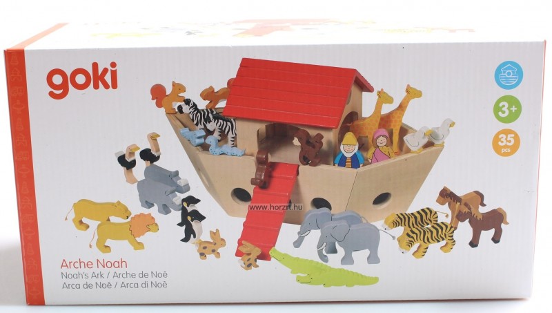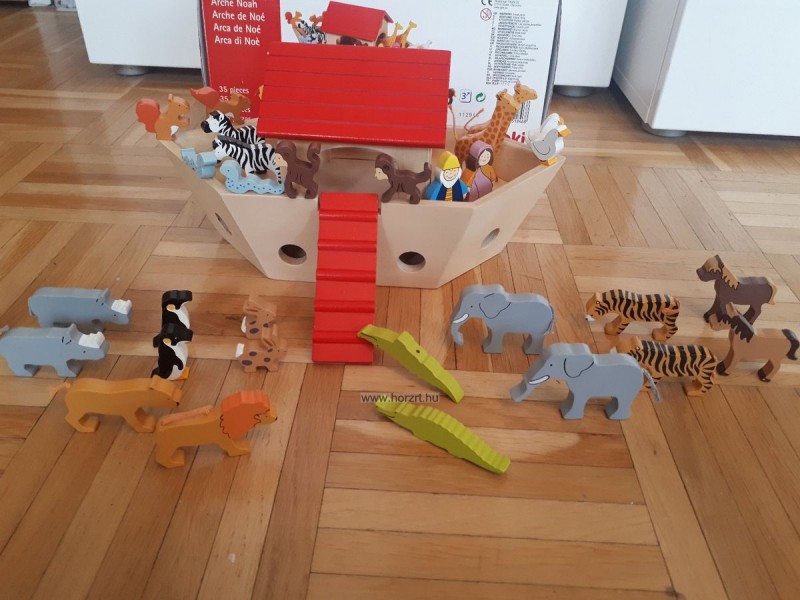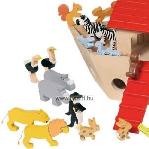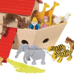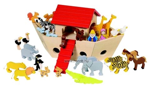 Fa bárka, fa állat figurákkal. Noé és felesége és 30 darab állat. 15féle állat párban.