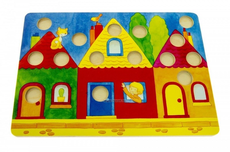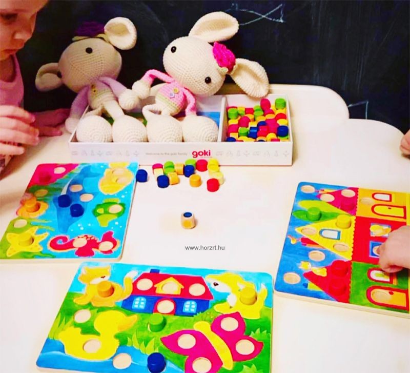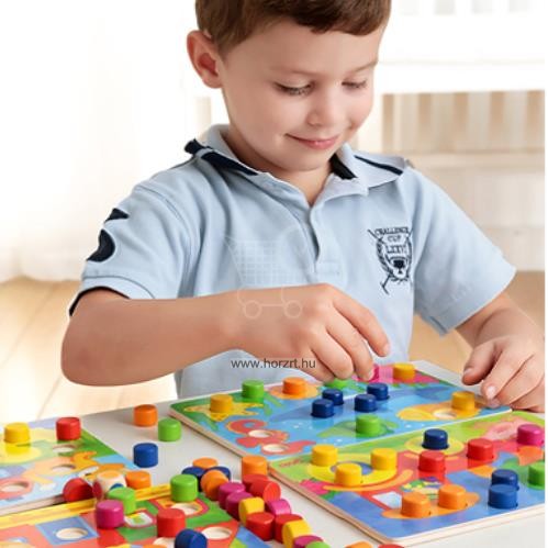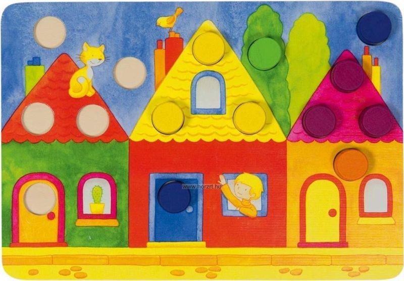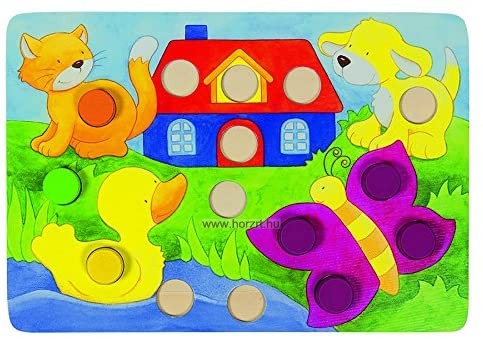 Ismerd meg játszva az színeket és formákat!A társasjáték tartalma: 4 fa játéktábla különböző helyszínekkel:otthon, a farmon, az akváriumban, a tónál 6 x 12 db színbábu citromsárga, piros, lila, kék, zöld és narancssárga színekben 1 db színes dobókocka. A játék célja elsőként kirakni az összes színt a saját játéktáblánkon.