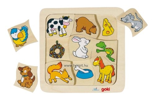 A Goki párosítós, puzzle kirakója teljes mértékben fából készült, egészségre káros anyagokat nem tartalmaz. A fatáblás kirakón ismert állatok láthatóak, mint például a madárka, a kutya, a múkus, a ló, a tehén, a béka, a medve, az egész vagy a nyuszi. Mind a 9 állat 1-1 puzzle elemen külön-külön helyezkedik el. A fatáblán az állatokhoz köthető eledelek láthatóak, így a gyermekeknek ki kell találni, hogy melyik állat mit eszik. Az állatok és az eledeleik is élénk színekkel lettek megfestve. A vidám és játékos jelleget erősíti, hogy a puzzle elemek nem szabályos formájúak, mindegyik lap széle hullámos. A tábla mérete 18x18 cm.
