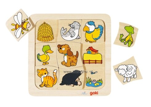 A Goki párosítós, puzzle kirakója teljes mértékben fából készült, egészségre káros anyagokat nem tartalmaz. A fatáblás kirakón ismert állatok láthatóak, mint például a madárka, a kutya, a méhecske, a cica, a fóka, a béka, a bárány, a kacsa vagy a vakond. Mind a 9 állat 1-1 puzzle elemen külön-külön helyezkedik el. A fatáblán az állatokhoz köthető élőhelyek láthatóak, így a gyermekeknek ki kell találni, hogy melyik állat hol él. Az állatok és az élőhelyeik is élénk színekkel lettek megfestve. A vidám és játékos jelleget erősíti, hogy a puzzle elemek nem szabályos formájúak, mindegyik lap széle hullámos. A tábla mérete 18x18 cm.