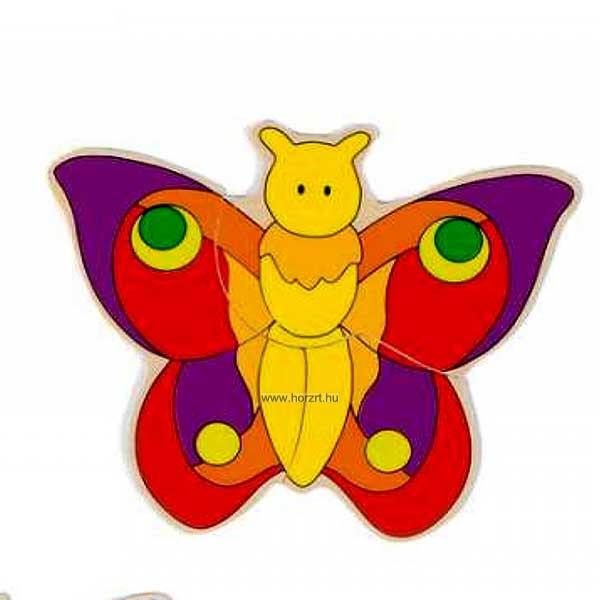 Fából készült szép, színes, vidám kirakó. 3 db, egyre nagyobb pillangót lehet kirakni összesen 11 puzzle elemből.