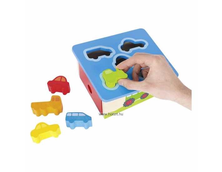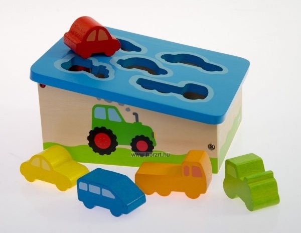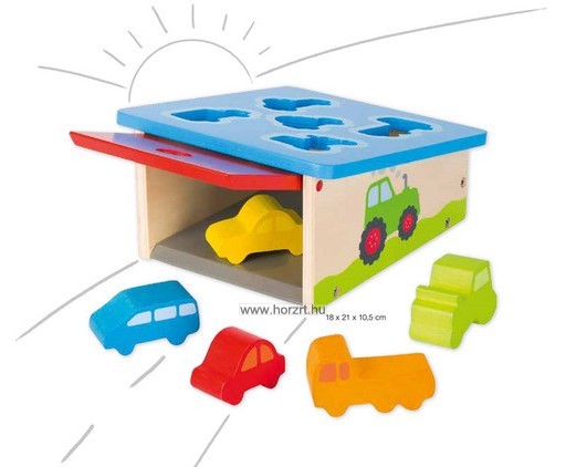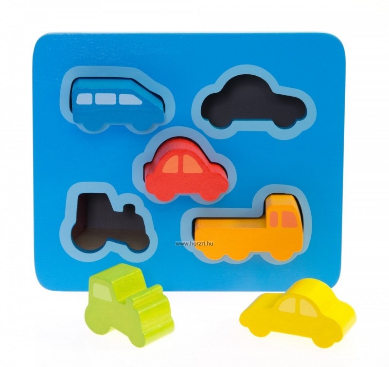 5 különböző formájú és színű autót tudsz a megfelelő formába behelyezni. Szín és forma felismerés. 12 hónapos korú gyermekek használatára CE minősítéssel ellátva!
