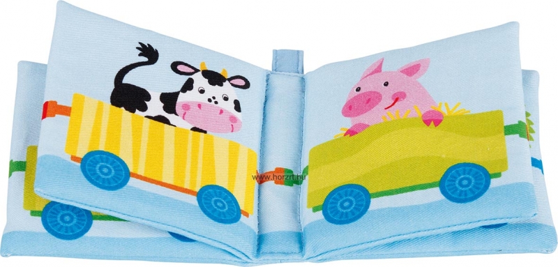 A pici könyv összesen 4 lapból áll, mely egy vonatot és rajta utazó állatkákat mutat, kellemes kék háttérrel.