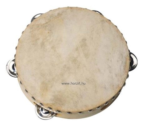 Valódi bőrből készült tamburin, fa keretben, 5 csengővel.
