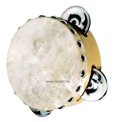 Valódi bőrből készült tamburin, fa keretben, 3 csengővel.