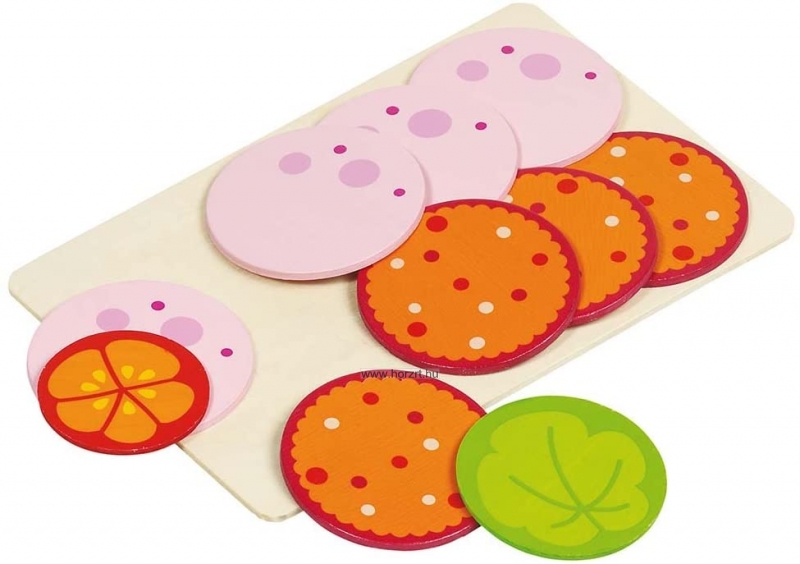 Fából készült, 8 szelet felvágott, 1 db paradicsomkarika, 1 db salátalevél, 1 db vágódeszka