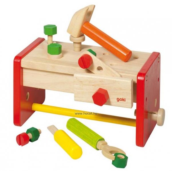 A játékhoz tartozó szerszámokkal (kalapács, villáskulcs, csavarhúzó) és csavarokkal a gyerekek vígan barkácsolhatnak.