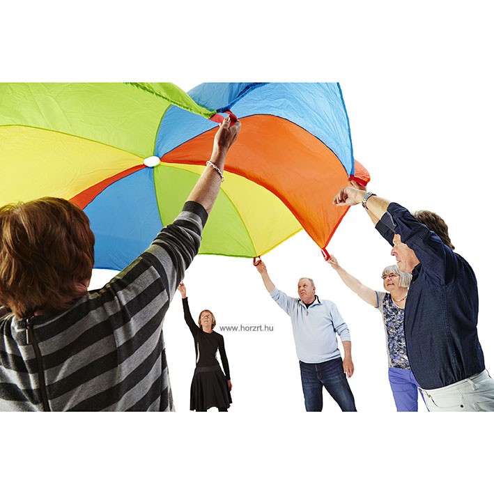 A színes, könnyű, tűzálló poliészterből készült, 8 db nagyon erős fogantyúval az ejtőernyő sokféle játékot és tevékenységet inspirál.