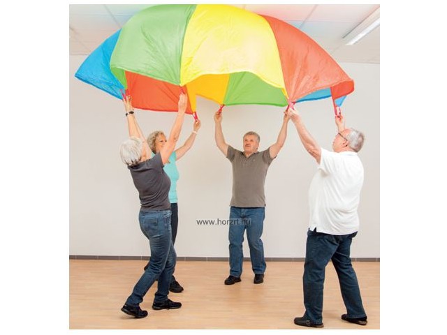 A kék, piros, sárga, zöld színű ejtőernyő minden korosztály számára biztosítja a testmozgást, és kiváló módja az alapvető fizikai koordináció fejlesztésének.