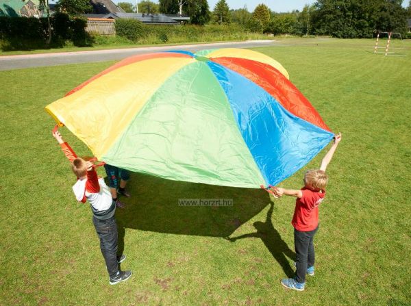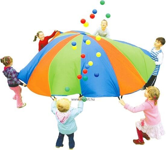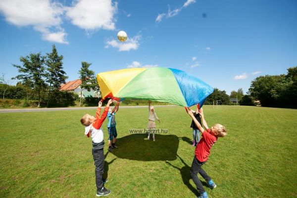 A színes, könnyű, tűzálló poliészterből készült, 12 db nagyon erős fogantyúval az ejtőernyő sokféle játékot és tevékenységet inspirál.