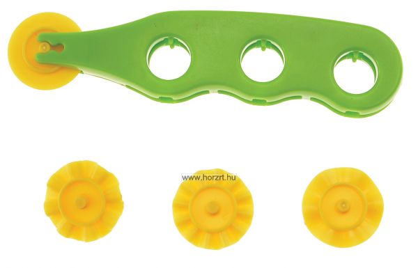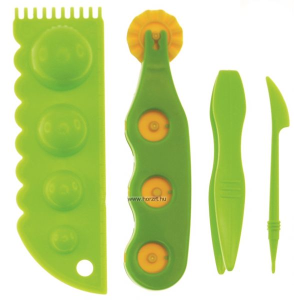 A Gowi 7 darabos gyurmázó szettjében megtalálható egy csipesz, egy kis vágókés és lyukasztó, egy 4 fejet tartalmazó görgős vágó, illetve egy komplex lyukasztó/csíkozó eszköz. A készlet erős műanyag anyagból készült, így hosszútávon lehet minden gyurmázás kiegészítője. Az elemeknek élénk zöld színe van, a 4 különböző fej pedig citromsárga. A fejek között megtalálható egy sima korong és további 3 hullámos vágó is, melyekkel más és más hullámok vághatóak ki. A fejeket a vágóeszköz markolatába lehet rögzíteni. A termék mérete: 9x2x1,5 cm, a csomagolás mérete: 14,5x10x1,5 cm.