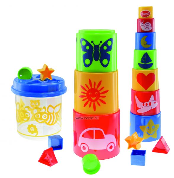 A játék tudatosítja a kicsikben a sorrendiséget, továbbá fejleszti a forma-, méret- és színfelismerést. A termék montessori toronyépítőként és formabedobóként is használható. Élénk és vidám színeinek köszönhetően sokáig leköti a kicsiket.