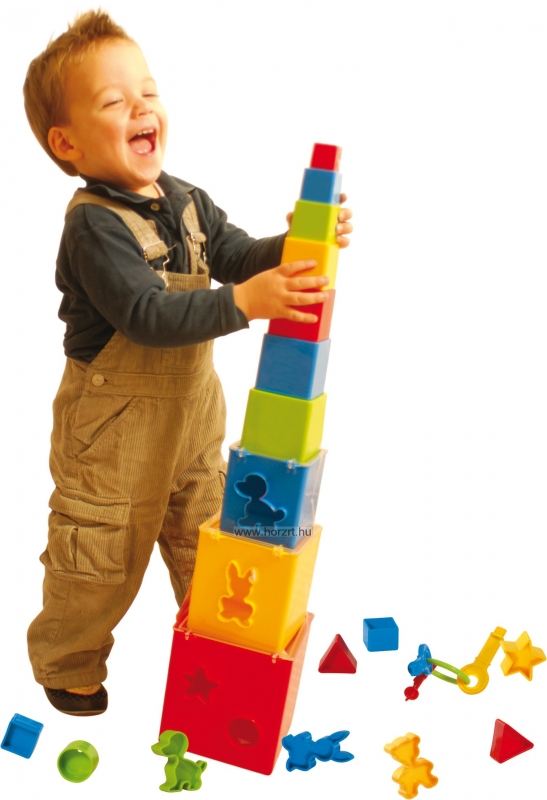 Ez a színes piramis nem hiányozhat egyetlen gyerekszobából sem! A színes, négyzet alakú formák 12 hónapos kortól ideálisak a babák számára. Tökéletesen illeszkednek a pici kezekbe és így könnyen egymásra tudják rakni, piramist alkotva. Ha kész, már le is lehet dönteni a tornyot és kezdeni a játékot előről.