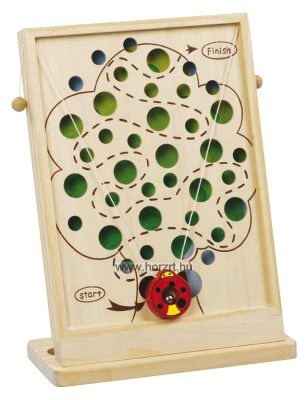 A zsinórok segítségével úgy kell mozgatni a golyót, hogy a lyukakat kerülgetve eljusson a célig.