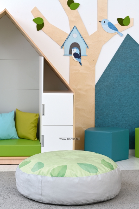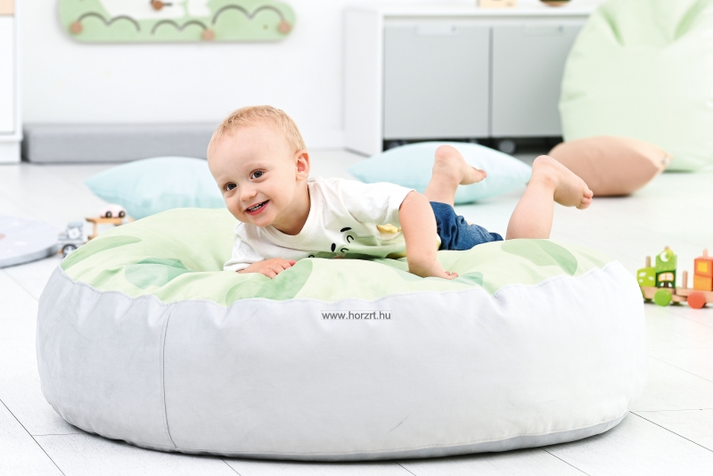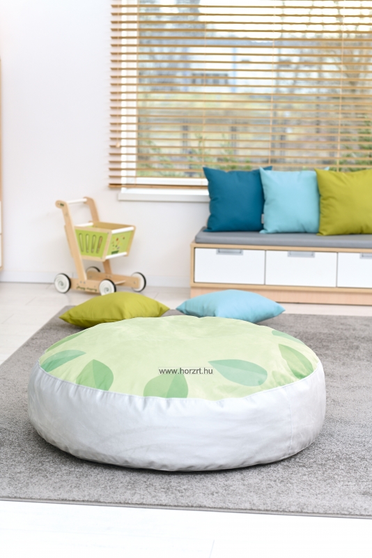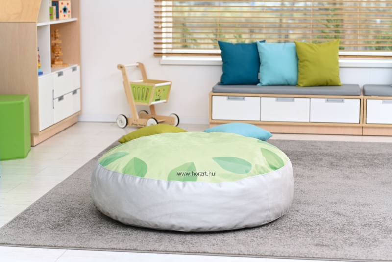 Az óriás kör alakú padlópárna halvány szürke és zöld színből áll össze. Az ülőfelülete halvány zöld színű és sötétebb zöld színű levelek díszítik. A párna szilikon szemcsékkel van töltev, külső huzata textil. Töltelékének köszönhetően körbeöleli a kisgyermeket, így a kényelmen felül biztonságot is nyújt. A külső huzata mosható. Átmérője: 100 cm.