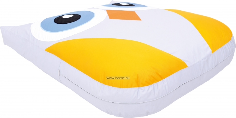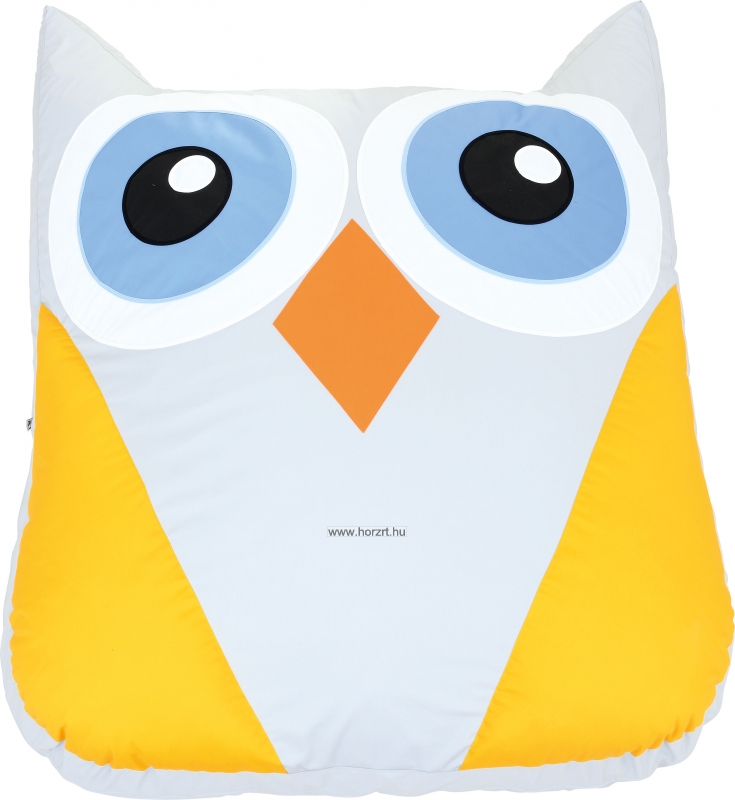 Az óriás bagoly mintájú és alakú padlópárna pasztell színekkel lett megalkotva. A bagoly teste világos szürke, szárnyai citromsárgák, csőre narancssárga, nagy szemei kékek, fehér szegéllyel. A párna formája lekerekített négyszög, füleinél háromszög alakú megnyújtással. A párna töltete habszivacs, huzata pamutszövet. A huzat lehúzható és mosható. Méretének köszönhetően több gyermek is biztonságosan és kényelmesen elfér rajta. Mérete: 147x180x20 cm.