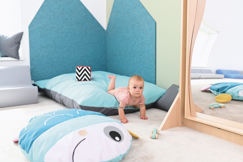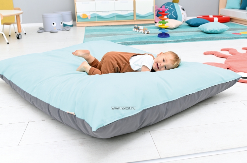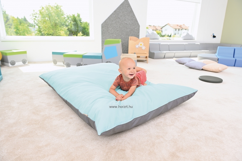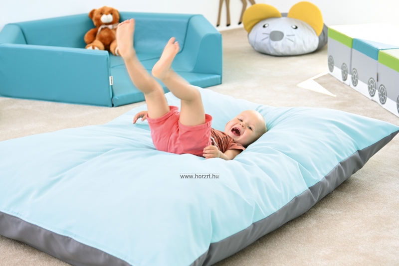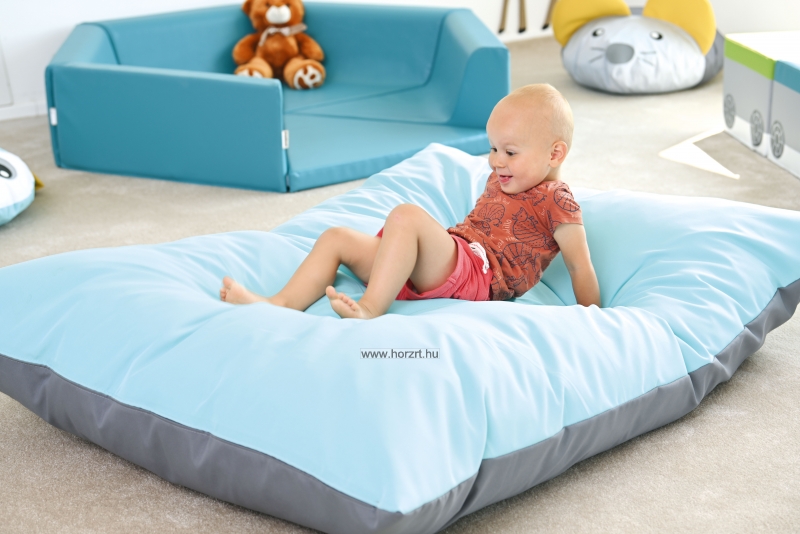 Az óriás padlópárna méretének és élénk kék színének köszönhetően impozáns eleme lehet az otthoni- és a csoportszobáknak egyaránt.