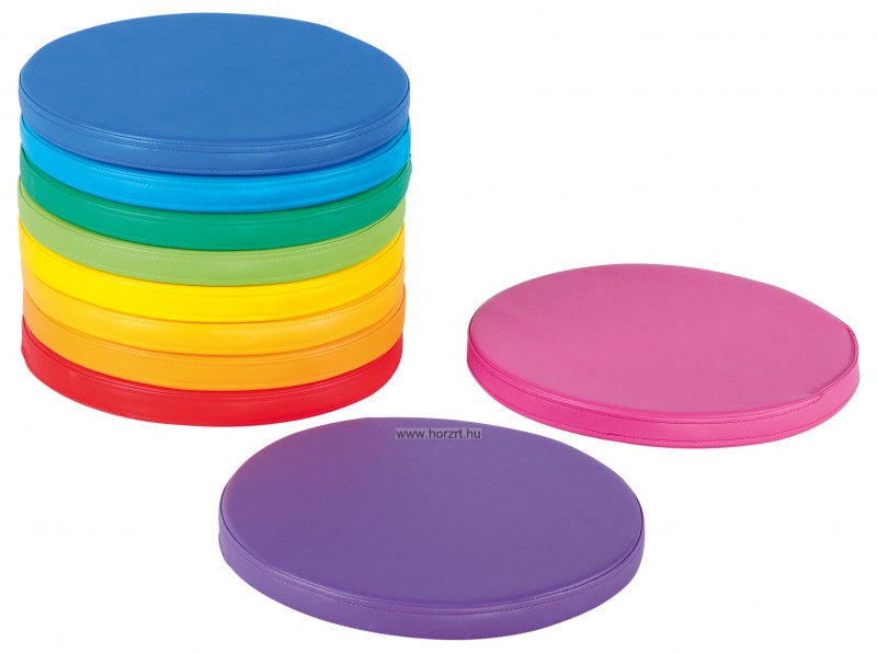 A kör ülőpárna szett 10 db, eltérő színű, műbőrrel bevont szivacs párnát tartalmaz. A készletben a lila, a rózsaszín és a piros párnán túl a kék, a zöld és a sárga árnyalatai találhatóak meg. Egy párna átmérője 35 cm, magassága 3 cm.