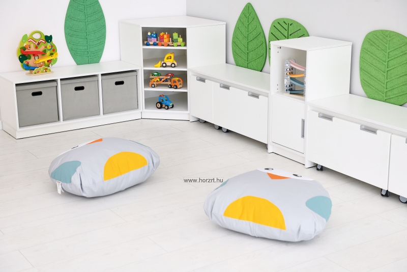 Habszivaccsal töltött textil borítású padlópárna lehúzható, mosható huzattal. Padlópárna gyerekeknek. Kényelmes sok oldalú kiegészítő otthonába, gyerekszobába vagy csoportszobába. A vidám és színes megjelenés mellett igen komfortos is. A párna alkalmas a földön ücsörgéshez, háttámlának vagy játékhoz.