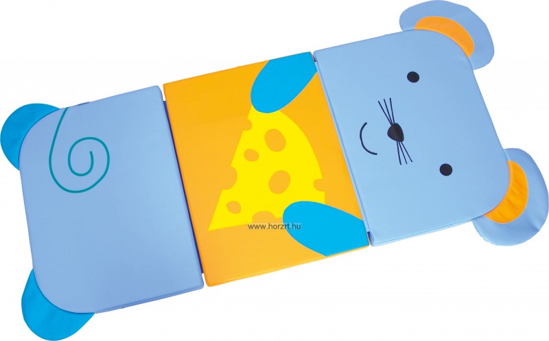 Több funkciós egérke matrac. Az összehajtható matrac használható kis kanapénak, de akár szivacsos szőnyegnek is. Az egérke teste kék és narancssárga színű. A szőnyeg tetején kék lekerekített kék-sárga fülecske, alján két kék lábacska található. Két kezével egy nagy sárga, lyukacsos sajtot tart maga előtt. A formák nem emelkednek ki a síkból. Arcán a fekete szemei, picike fekete orra, bajsza és mosolygós szája bájos megjelenést kölcsönöz neki. A matrac alső harmadában látszik a kunkori farkincája, ami sötétkék színű. A matrac bevonata műbőr, belseje habszivacs. Mérete: 197,5x114x5 cm. Három részbe hajtható.
