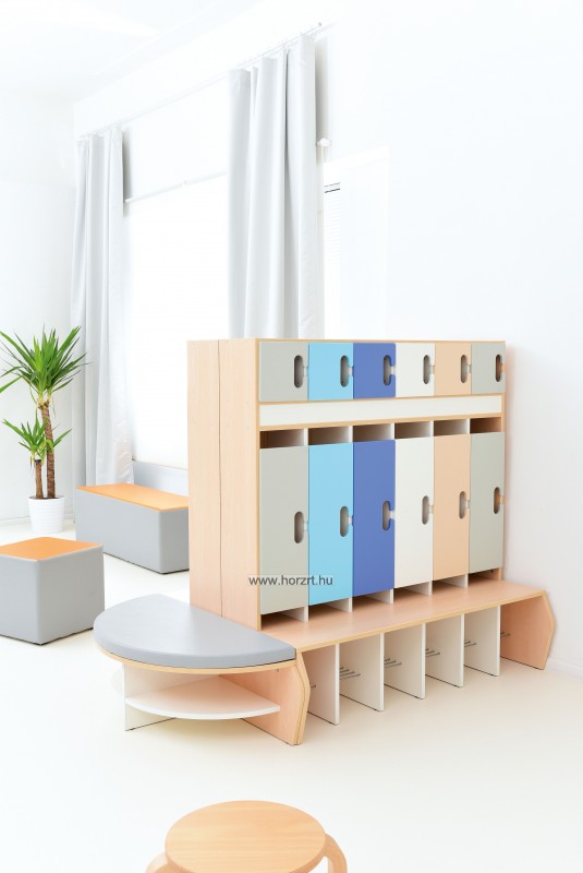 Bambi gyereköltözőszekrény, 6 személyes. A szekrény mérete: 126x50x134 cm. Ülésmagasság: 33 cm. Ülés mélység: 23 cm. Kis fakk mérete: 19x22,5x19 cm. Nagy fakk mérete: 69,5x22,5x19 cm. Cipőtartó polc magassága: 20 cm. Az öltöző laminált bútorlapból készül, mely juhar és fehér színű. A bútor oldalai és ülőfelülete juhar, a fakkokat elválasztó lapok fehér színűek. A cipőtároló rekeszben fém rudakra helyezhetőek a kiscipők. A szekrény 3 részre van osztva, felül a kis fakkok, középen a nagy fakk, alul pedig a cipőtartó polc található. A fém kampókat a termék tartalmazza. A öltözőszekrényhez különböző színekben vásárolható ajtószett, ezeket a csomag nem tartalmazza.