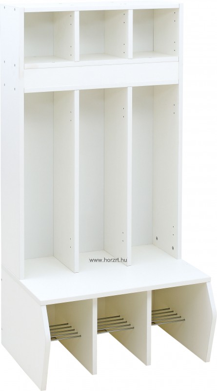 Az öltözőszekrény juhar árnyalatú natúr és fehér laminált bútorlapból készült. A fém kampókat a termék tartalmazza.