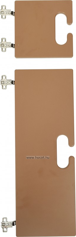 Ajtószett Bambi gyereköltözőhöz. Az ajtószett 2 db, sötétbarna ajtót tartalmaz. Az ajtók 2-2 strapabíró kivetőpánttal csatlakoznak a szekrényhez. Külön fogantyúja nincsen, szépen megmunkált ovális kivágások segítik a kinyitást, illetve biztosítják a szekrény, így a benne lévő ruhák szellőzését is. Az ajtók anyaga színes MDF bútorlap. A felső, kisebb ajtó mérete: 20x20 cm. Az alsó, nagyobb ajtóé: 20x57,5 cm.