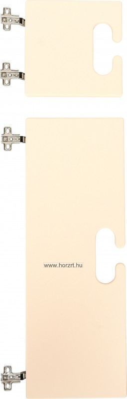 Ajtószett Bambi gyereköltözőhöz. Az ajtószett 2 db, bézs ajtót tartalmaz. Az ajtók 2-2 strapabíró kivetőpánttal csatlakoznak a szekrényhez. Külön fogantyúja nincsen, szépen megmunkált ovális kivágások segítik a kinyitást, illetve biztosítják a szekrény, így a benne lévő ruhák szellőzését is. Az ajtók anyaga színes MDF bútorlap. A felső, kisebb ajtó mérete: 20x20 cm. Az alsó, nagyobb ajtóé: 20x57,5 cm.