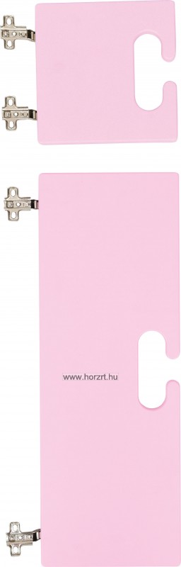 Ajtószett Bambi gyereköltözőhöz. Az ajtószett 2 db, világos rózsaszín ajtót tartalmaz. Az ajtók 2-2 strapabíró kivetőpánttal csatlakoznak a szekrényhez. Külön fogantyúja nincsen, szépen megmunkált ovális kivágások segítik a kinyitást, illetve biztosítják a szekrény, így a benne lévő ruhák szellőzését is. Az ajtók anyaga színes MDF bútorlap. A felső, kisebb ajtó mérete: 20x20 cm. Az alsó, nagyobb ajtóé: 20x57,5 cm.