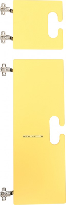 Ajtószett Bambi gyereköltözőhöz. Az ajtószett 2 db, citromsárga ajtót tartalmaz. Az ajtók 2-2 strapabíró kivetőpánttal csatlakoznak a szekrényhez. Külön fogantyúja nincsen, szépen megmunkált ovális kivágások segítik a kinyitást, illetve biztosítják a szekrény, így a benne lévő ruhák szellőzését is. Az ajtók anyaga színes MDF bútorlap. A felső, kisebb ajtó mérete: 20x20 cm. Az alsó, nagyobb ajtóé: 20x57,5 cm.