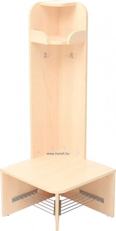 A szivárvány öltözőszekrény termékcsaládhoz tartozó sarokelem alacsony verziója kimondottan intézmények számára, a legkisebb korosztály életkori sajátosságait figyelembe véve lett megtervezve. A pad ülésmagassága: 26 cm. Az ülőfelület alatt két cipőtároló rácsos polc található. A hátlapon kettő fém akasztó és egy közös polc kapott helyet. A polc szélei magasítottak, így biztonságosan tárolható rajta bármilyen kisebb tárgy. Az öltözőszekrény juhar színű laminált bútorlapból készült, melynek köszönhetően tartóssá és könnyen tisztíthatóvá válik. A termék mérete: 47x47x124,5 cm